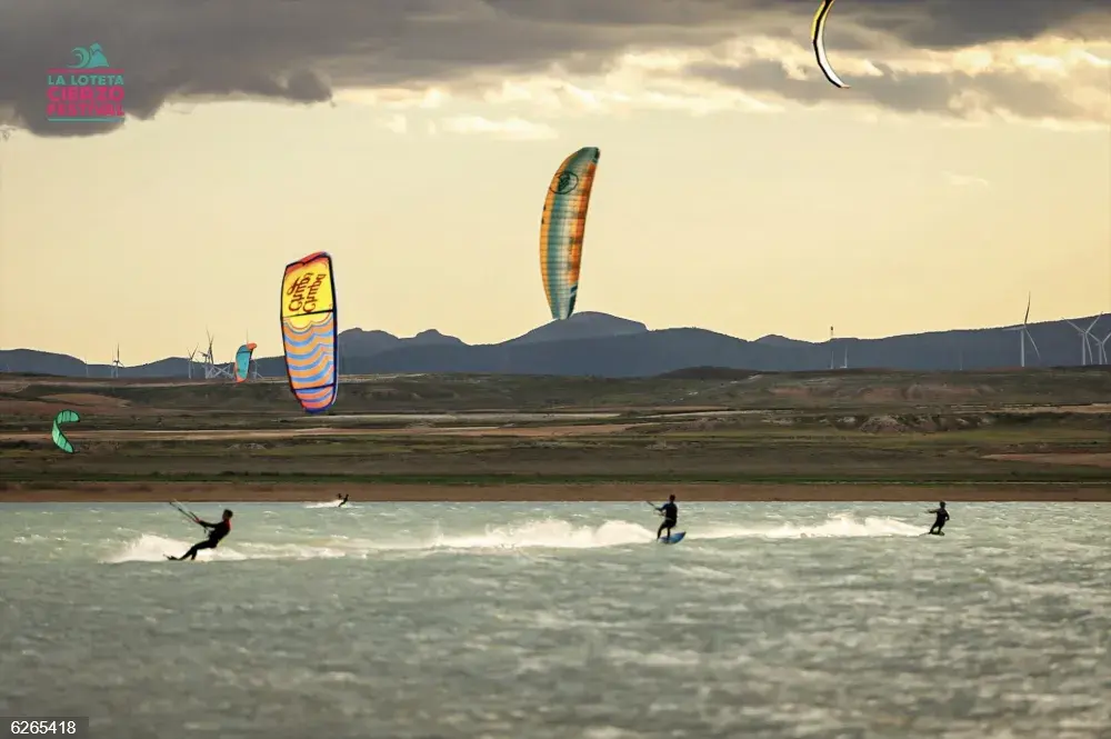 El contraste es parte de su atractivo: donde se esperan campos de cereal y viñas, emergen velas de colores que cortan el cielo y tablas que avanzan deslizándose como si Aragón se hubiese transformado en Tarifa. La laguna sur, más plana, permite la práctica del freestyle; otras zonas invitan a carreras o al simple placer de dejarse llevar. Incluso para quienes no suben a la tabla, basta con acercarse a la orilla para sentir cómo el aire azota la cara y devuelve una sensación de libertad primaria. La Loteta es, en esencia, un mar en miniatura al que el cierzo ha dado alma.